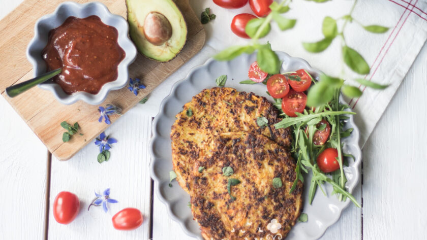Kartoffel-Zucchini-Möhren-Puffer mit Barbecue Soße – Vegan und Glutenfrei